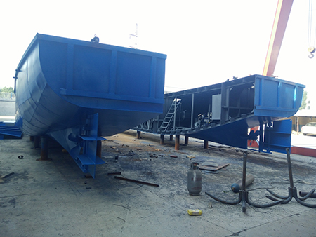 發(fā)往斐濟(jì)共和國的制造中的100噸近海甲板駁船。濰柴船用機(jī)、杭齒變速箱、ccs級